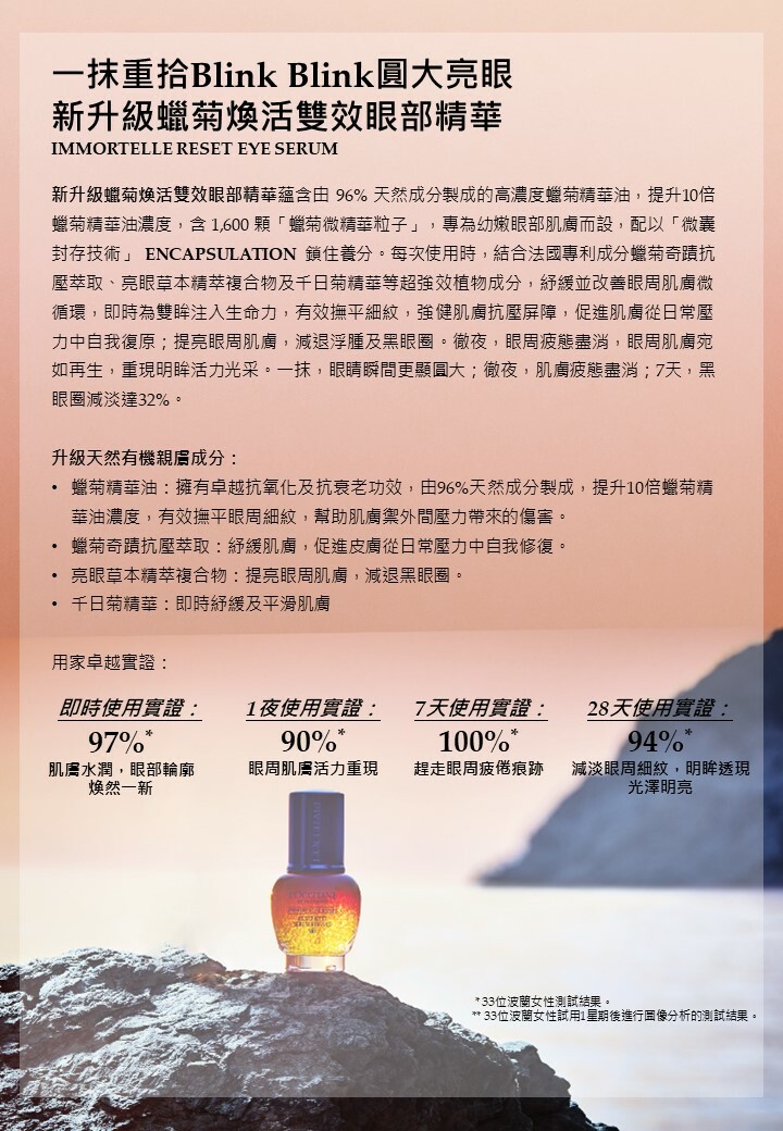 蠟菊煥活雙效眼部精華蘊含由96%天然成分製成的高濃度蠟菊精華油 ,有效撫平細紋,強健肌膚抗壓屏障,促進肌膚從日常壓力中自我復原;提亮眼周肌膚,減退浮腫及黑眼圈。