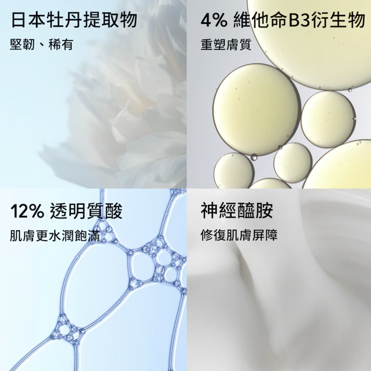 一款有效減淡色斑痘印、修飾毛孔,平衡,重塑,提升肌膚屏障的保濕精華,打造花瓣般柔軟,由內而外散發光芒的肌膚。