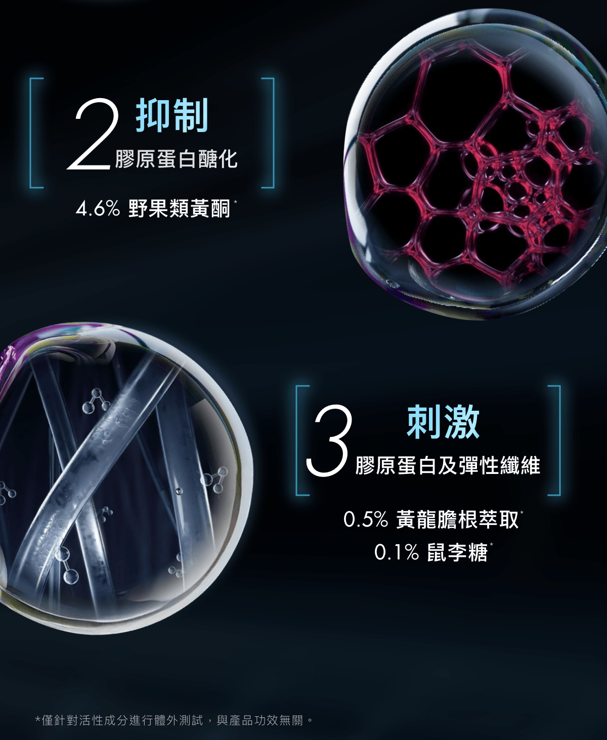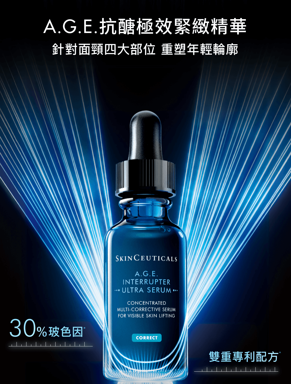 A.G.E.抗醣極效緊緻精華擁有雙重專利配方⁺,蘊含多種高效活性成分,包括專利成分30%玻色因^,4.6%野果類黃酮*,0.5%黃龍膽根萃取*及0.1%鼠李糖*,幫助重塑基底膜,鞏固膠原結構的完整性,同時抑制膠原蛋白醣化^,抵禦自由基侵害,發揮最佳的緊緻提拉效果,令肌膚更顯立體、飽滿、彈嫩