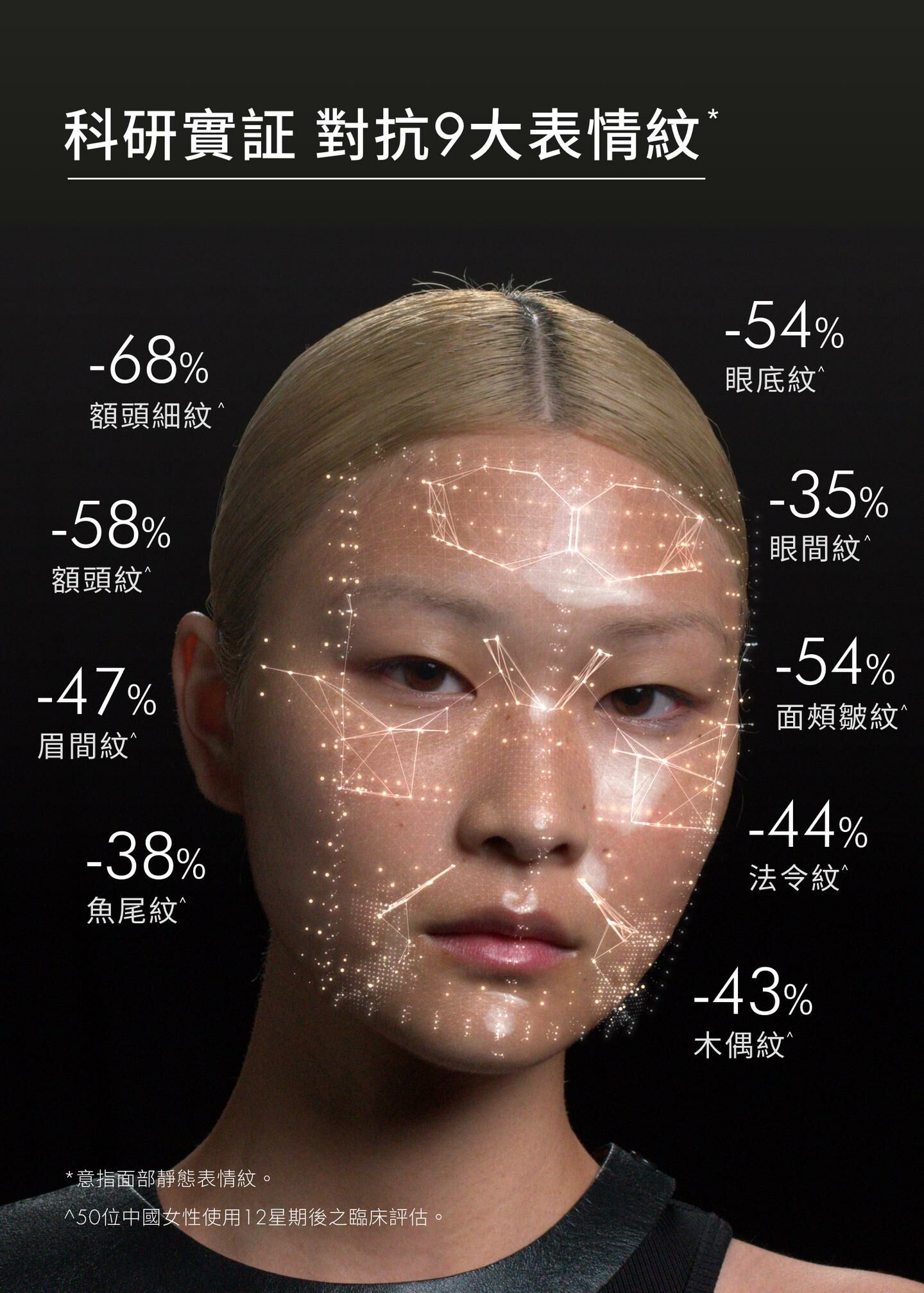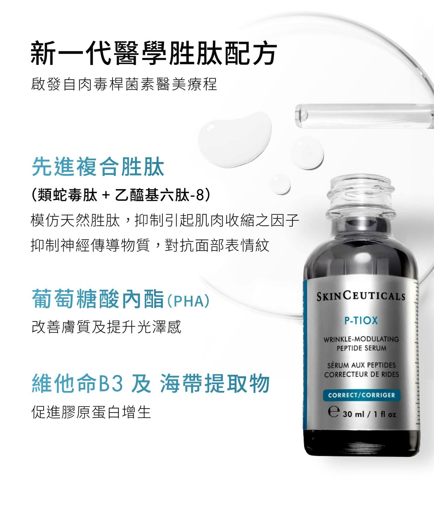 受肉毒桿菌素醫美療程啟發,胜肽抗皺精華研發新一代胜肽配方,蘊含複合胜肽(類蛇毒肽+乙醯基六肽-8) 、葡萄糖酸內酯 (PHA) 、維他命B3及海帶提取物,對抗面部表情紋^,促進膠原蛋白增生,改善膚質及光澤感,見證肌膚回復飽滿緊緻。